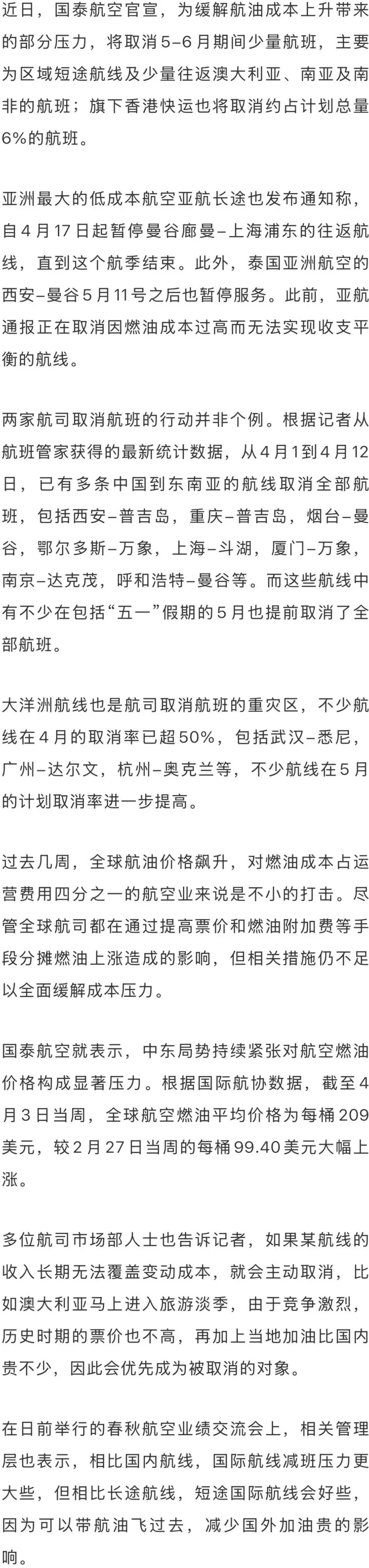 记者从多家航空公司获悉,从4月最先自动取缔的航班确凿有所增长,此中东南亚及年夜洋洲是重头,这与油价的年夜幅上涨不无瓜葛。比拟海内,部门国际机场加油价格更高,叠加需乞降竞争的影响,部门航路的取缔就首当其冲。
